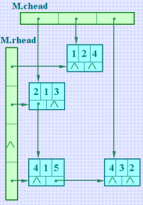 对于每个输入的非零元,既要插入在行链表中,又要插入在列链表中,算法5.4没有限定输入顺序,因此对每个输入的非零元都需要在相应的行链表和列链表中查询结点的插入位置,因此算法5.3的时间复杂度为O (t×s),其中 t 为所建矩阵中非零元的个数,s 为其行列的最大值。 显然这种存储表示便于进行将改变其中非零元状态的矩阵运算,如将一个矩阵加到另一个矩阵上的运算等。 |