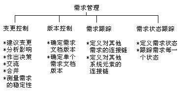 3.5.1 需求管理的内容 前面提到,需求工程包含需求开发和需求管理两部分。需求开发包括对一个软件项目需求的获取、分析、规格说明及验证,其主要结果包括各种需求文档和分析模型。经过评审批准,这些文档就定义了开发工作的需求基线,这个基线在客户和开发人员之间就构筑了计划产品功能需求和非功能需求的一个约定。 需求约定是需求开发和需求管理之间的桥梁,需求管理包括在软件开发过程中维持需求约定集成性和精确性的所有活动,如下图所示。