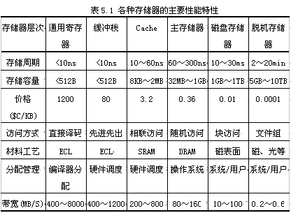 通用寄存器堆、指令和数据缓冲栈、一级Cache是在CPU芯片内部的,它们的工作速度比较高。从二级Cache以下,是在CPU外部的,工作速度逐级明显降低。如果用i表示层数,则有工作速度:Ti<Ti+1;存储容量:Si<Si+1;价格:Ci>Ci+1; 因为存放在各种存储器中的程序和数据,最终都要送到CPU中进行处理,CPU的速度很高,因此,希望各层次存储器的工作速度要尽量往上面靠近,而存储容量和价格尽量往下面靠近。 各级存储器的主要性能指标见表5.1所示。这些指标仅供参考,因为随着时间的推移,有些指标在不断变化。 |