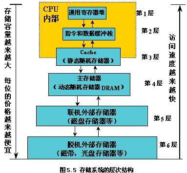 在同一台计算机中,有各种工作速度,存储容量,访问方式,用途等均不相同的存储器,这些存储器构成一个层次结构,如图5.5所示。从上到下,各种存储器的存储容量越来越大,每位的价格越来越便宜,但存储周期越来越长。 |