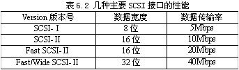 有多种用于磁表面存储器的标准接口: 1.IDE(integrated drive electronics)接口 IDE接口是目前微机中常用的标准磁盘接口,有普通IDE接口和增强型IDE(EIDE :enhanced integrated drive electronics)接口等。 普通IDE接口:数据传输率不超过1.5Mbps,数据宽度为8位,最多可连接4个IDE设备,每个IDE磁盘的容量不超过528MB。 增强型EIDE接口:数据传输率可达在12Mbps以上,数据宽度为32位,最多可连接4个IDE设备,每个IDE磁盘的容量可以超过528MB。 2.SCSI(small computer system interface)接口 1984年首先用于Macintosh机中,目前已经在工作站、服务器和微机中得到广泛应用。 SCSI接口可以用来连接磁盘、磁带、光盘存储器、各种数字图象设备、音频设备等,是一种系统级标准设备接口。 数据宽度有8位、16位和32位等多种。 SCSI设备之间采用雏菊链(daisy chained)形式连接,每个设备有一个唯一的设备号,设备之间独立工作,相互之间可以交换数据。 一个SCSI接口能够连接7个、15个或31个设备。通常把最后一个设备号分配个SCSI接口自己。 与上面几种磁表面存储器接口相比,SCIS接口能够承担更多的数据传输和控制任务,传输的速度也比较高。 几种主要SCSI接口的性能特性如表6.2所示。 |