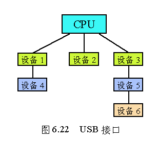 USB(Universal Serial Bus)接口又称为P1394串行接口,它符合ANSI(美国国家标准化学会)标准。 通过USB能够把多台高速外部设备连接到处理机上。 USB的主要优点:采用串行通信方式,连接线少,可靠性高,便于远距离通信。能够连接多台外部设备。 USB接口采用雏菊链方式连接外部设备,每一个端口能够连接63台各种设备,如果采用桥(Bridge)互连方式,以树型结构配置,可以连接多达1022台设备,如图6.22所示。 |