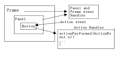 | 例如,如果用户用鼠标单击了按钮对象button,则该按钮button就是事件源,而java运行时系统会生成ActionEvent类的对象actionE,该对象中描述了该单击事件发生时的一些信息,然后,事件处理者对象将接收由java运行时系统传递过来的事件对象actionE并进行相应的处理。