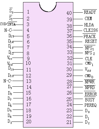 80287是被做在单个芯片之内,并用40条引线的外壳封装。它不是一个简单的浮点运算器本身,而且包括执行数据运算所需要的全部控制线路。这个器件的引线分配如图2.24所示。