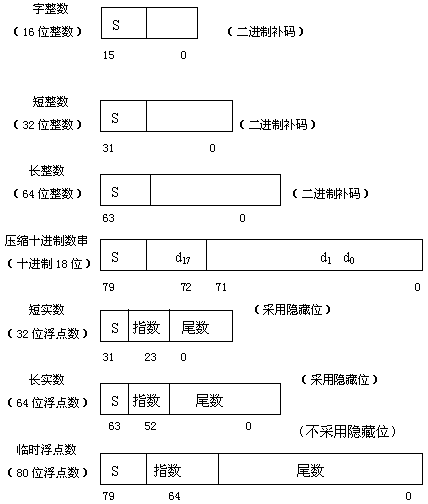 此处,S为符号位,0代表正,1代表负。三种浮点数,阶码的基数均为2,用移码表示阶值,尾数均用原码表示。浮点数有32位、64位和80位三种长度。80287在从存储器取数和向存储器写数时,均用80位的临时实数和其它数据类型执行自动转换,全部数据,在80287中均以80位临时实数的形式表示。