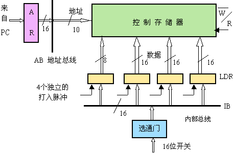 在手工拨入微指令前,要用水平板上的16位开关的低10位拨入控存地址。此时,是把开关拨好的地址值经选通门送到教学机的内部总线,再送入程序计数器PC中和地址寄存器AR中,至此就把控存地址送到了地址总线,并作为控存的地址来源之一。以后每写入一条微指令,使PC加1送PC和AR,作为写入下一条微指令的控存地址,支持连续写入操作。