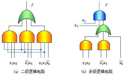 | 对应的电路示于图4.14(b),共需4个门,10个输入端。由此可见,提取公因子后可导致: (1)元件的输入端减少,可解决扇入FI所带来的限制。同时也缓解了扇出FO所带来的限制。 (2)成本有可能降低。 (3) 逻辑级数有可能增加,即电路的总延迟时间可能增加。 本节重点讨论如何用立方体运算提取公因子。 |