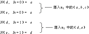 | 因此,(d,e)保持不变。 于是, π2 = {(a ,b),(c),(d,e)} Step3 π2≠π1 转Step2 Step2' K = K + 1 = 3; π3 = π2 = {(a ,b) ,(c),(d ,e)} 对 π3 中每一个类进行检查,均符合置换性划分的要求,故不再继续划分。 Step3' 因 π3 = π2 , 算法结束, π3 就是最终结果。