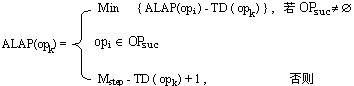 | 其中,TD ( opi )是操作opi的延迟时间,即实现操作opi所需的控制步数目,OPpre是操作opk的直接前趋集。 定义5.2 在不考虑硬件资源约束的条件下,操作opk可以开始执行的最迟时间称为该操作的最迟控制步。用ALAP(opk)表示: |