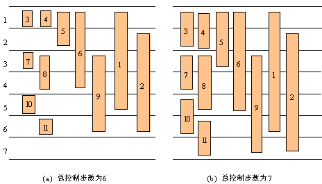 定义5.3 操作opk的最早控制步与最迟控制步之差是该操作可以开始执行的区间,称为该操作的调度区间。用SA( opk )表示。 SA( opk ) = [ ASAP( opk ), ALAP( opk ) ] 操作的调度区间确定了该操作只能在该区间内的某个控制步开始执行。图5.17(a)和(b)分别给出了diffeq各操作在6个和7个控制步时的调度区间。当总的控制步数为6时,所有关键路径上的操作的调度区间均为1,即他们只能被调度到其相应的控制步中;操作5(处于非关键路径中)的调度区间为2,它可以被调度到第1或第2控制步中。当总的控制步数为7时,ASAP调度算法实际上只占用了前6个控制步,ALAP调度算法实际上只占用了后6个控制步。此时,关键路径上的操作3的调度区间为[1,2],它可以被调度到第1或第2控制步中;操作5(处于非关键路径中)的调度区间为[1,3],它可以被调度到第1、第2或第3控制步中的任何一个。