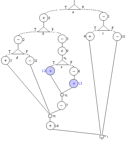 | 局部合并法从带有嵌套分枝结构的最内层开始,逐层向外进行分枝操作的合并处理。现在以图5.22所示带有嵌套分枝结构的控制数据流图为例,展示对条件分枝局部合并处理的过程。为了明显地展示合并过程,将合并前可合并的操作用蓝色表示,合并后的操作用红色表示。为此,将图5.22重新画于图5.24。 对图5.24最内层条件分枝c, d和e进行合并处理,合并后的等价控制数据流图示于5.25(a),其中操作12和13合并为操作{12,13}。接着对内层条件分枝b进行合并处理,合并后的等价控制数据流图示于5.25(b),其中操作2与操作3合并为操作{2,3},操作5与操作9合并为操作{5,9},操作7与操作11合并为操作{7,11}。最后对最外层条件分枝a作合并处理,合并后的等价控制数据流图示于与5.25(c) 。