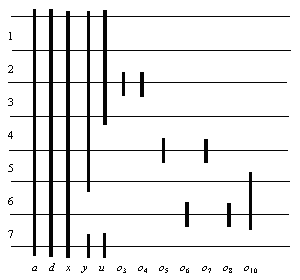 表5.5和图5.31都是用来表示变量的生存期,是等价的两种表现形式。从人的感觉上看,图比表更直观一些。我们从表5.5转化为图5.31,仅仅是为了便于读者理解。