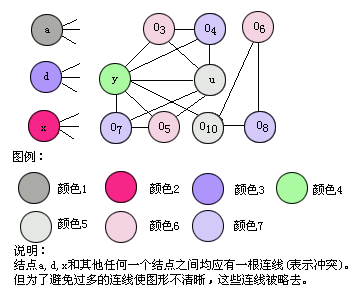 为了便于观察,根据表5.5所列各变量的生存期,画出各变量生存期的示意图(图5.31)。由此可以产生寄存器分配的冲突图,示于图5.32。由于变量a , x 和d的生存期为整个循环周期,他们的生存期和其他变量的生存期永远重叠,因而他们和所有结点均有冲突,他们和每一个其他结点之间都应该有一条连线。为了图形清晰,我们在图5.32中省略了结点a , x , d和其他结点之间的连线。