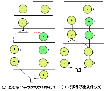 在控制数据流图中,操作的执行顺序应该严格遵循数据相关性关系。而除汇聚结点射出的反馈边(用于循环控制)之外的其他控制相关性关系,并不严格地规定操作的执行顺序。这主要是指条件分枝中的操作可以在分枝条件确定前执行,即条件分枝中的操作可以移出条件分枝。 图5.34(a)是一个具有条件分枝的控制数据流图。该例子的硬件约束条件为:1个加法器,1个实现减法与比较操作的功能单元{-,<}。调度结果显示需要6个控制步才能完成。如果考虑把操作5与操作6移出条件分枝,使他们在分枝条件确定之前(即操作2完成之前)开始执行,则只需5个控制步即可实现,如图5.34(b)所示。 应该注意的是:若操作移出条件分枝在条件操作之前执行,则该操作就不再属于这个条件分枝,无论条件分枝处于那一枝该操作都必须执行。即该操作条件向量相应于这个分枝条件的元素取值为X。