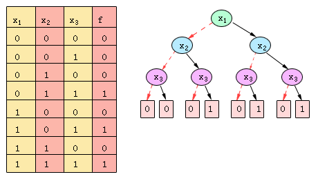 | 用二叉判决图BDD来表示布尔函数是Akers[6]在1978年提出的。1986年,Randal E. Bryant对BDD进行改进[7],对BDD中的变量顺序作了一些限制,从而使BDD成为一种正则的布尔函数表示方法。 BDD是基于先农多项式(Shannon expansion)展开得到的,对f(x1,…, xn)来说,先农多项式为: BDD用图来表示,是一个带根的有向无环图。图6.2给出函数f(x)=x1x3+x2x3 的真值表和BDD表示。从图中可看出,在未经化简的情况下,BDD为完全二叉树。每一个非叶子节点v被标上变量var(v),并有弧指向两个孩子:lo(v)(用虚线表示)代表该变量取值为0,hi(v)(用实线表示)代表该变量取值为1。叶子节点被标为0或1。对于给定的一组变量值,从根节点到叶子节点的一条路径是确定的,函数的值也就是该叶子节点的值。由于给定了变量序和分解顺序,该BDD中叶子节点的值(从左到右)与真值表中的值(从上到下)一一对应。