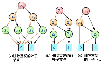 | 下面给出BDD化简的三条规则,经过下述规则化简后的BDD与原BDD在功能上等价。 删除重复的叶子节点:对于一个给定的标号,删除所有重复的叶子节点,只留下其中一个,并把指向已删除叶子节点的弧指向保留的那个叶子节点。 删除重复的非叶子节点:对于非叶子节点u和v,如果var(u)=var(v),lo(u)=lo(v),hi(u)=hi(v),删除两个节点中的一个,并把指向已删除节点的弧指向未删除的那个节点。 删除冗余非叶子节点:对于非叶子节点u,如果lo(u)=hi(u),删除u节点,并把指向u节点的弧指向lo(u)。 从任何一个有序二叉判决图OBDD开始,我们可以不停地应用上述规则对之进行化简。我们称最大程度化简了的有序BDD为ROBDD。下面我们提到OBDD就是指ROBDD。 图6.3给出将图6.2所表示的有序BDD化简至OBBD的过程。A中应用第一条规则将八个叶子节点减少到两个,B中应用第二条规则将四个非叶子节点x3减少到两个,C中应用第三条规则删除两个非叶子节点。一般来说,这三条规则要反复使用,因为每次应用其中一条规则进行化简所产生新的BDD都可能需要应用其它规则做进一步化简。