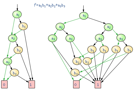 | OBDD的大小和形状不但与函数本身有关,也依赖于变量的顺序。对于同一函数,好的变量序的选择可以大大简化它的OBDD表示。图6.4布尔函数a1b1+a2b2+a3b3不同变量序的OBDD表示,图中(a)图变量序为a1<b1<a2<b2<a3<b3,(b)图变量序为a1<a2<a3<b1<b2<b3,仅仅由于变量序的不同,左图的非叶子节点数等于输入变量数,而右图的非叶子节点数则与输入变量数成指数关系。表6.1中给出几个通用布尔函数OBDD表示的复杂性。从表中可看出,有些函数可以通过选择一个好的变量序来简化,而对另一些函数,例如整数的乘法,不论怎样选择变量序,它的OBDD表示总是与输入变量数成指数关系。在实际应用中,变量序的选择一般是通过启发式算法来进行。只要能避开指数级增长,OBDD这种表示方法就能有相当高的效率。