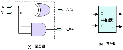 首先我们用门电路构建一个1位半加器,如图8.10(a)所示,接着我们试图把半加器作为一个子电路用来构建一个1位全加器。为此,我们为图8.10(a)所示半加器建立一个符号图,示于图8.10(b)。